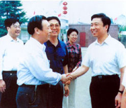 | 社會(huì)保障部鄭部長(zhǎng)(右一)在北京親切接見(jiàn)董事長(zhǎng) | 廣電部孫部長(zhǎng)(左一)來(lái)公司視察工作 |